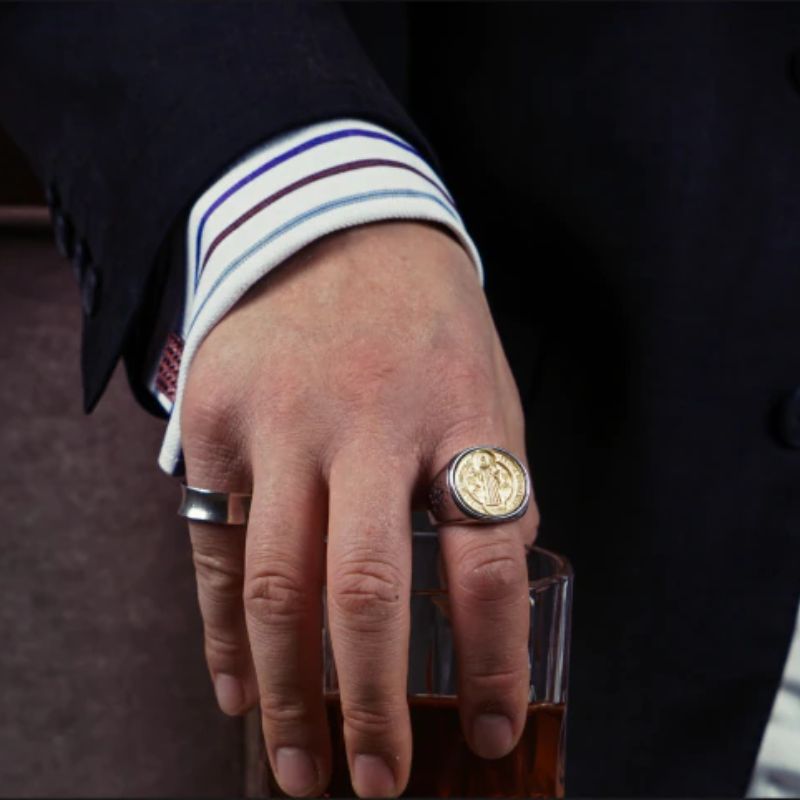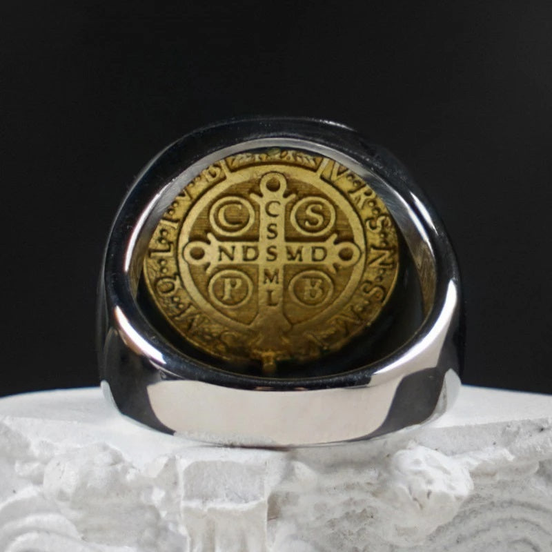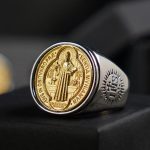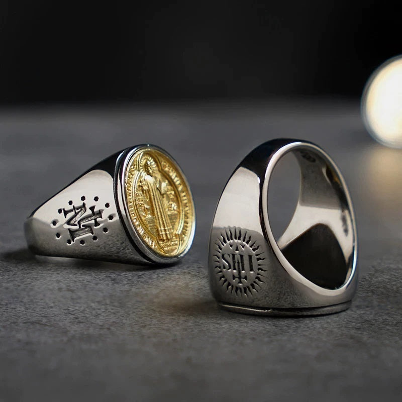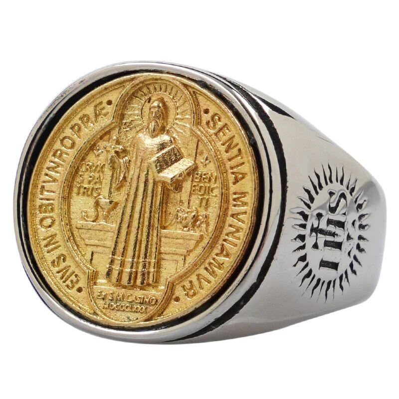 Cet anneau bicolore arbore une face ronde dorée avec une représentation fidèle du Saint-Bénisse. Ce bijou finement gravé exprimera avec élégance votre foi, vous offrant un style distingué en toute circonstance.