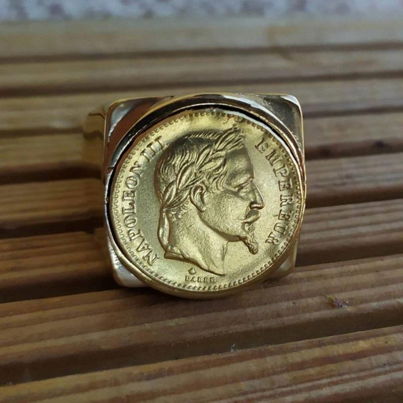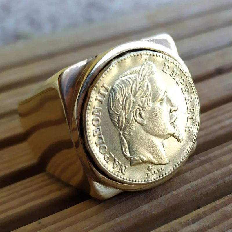 Bague anneau artisanale, cette création inclut une pièce de monnaie qui s’insère facilement dans son emplacement. En acier inoxydable massif de haute qualité, cette chevalière arbore une réplique exceptionnelle de la pièce de 20 francs or Napoléon III sur l’anneau. En laiton avec une couche d’or, cet anneau est conçu pour durer.