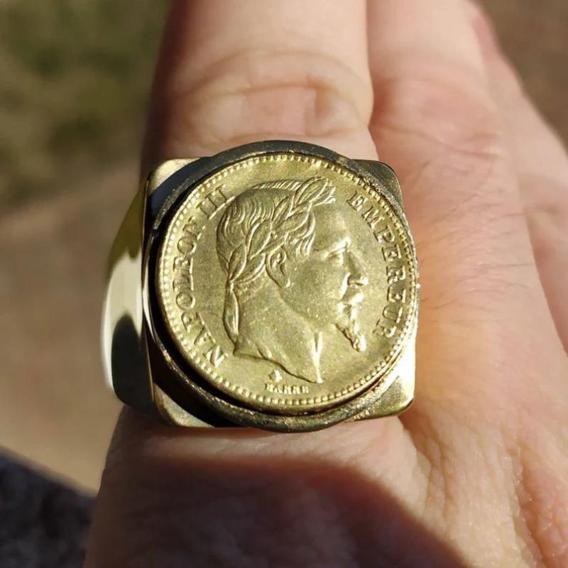 - Une bague anneau ornée d’une réplique précise de la pièce de 20 Francs Or Napoléon III,
